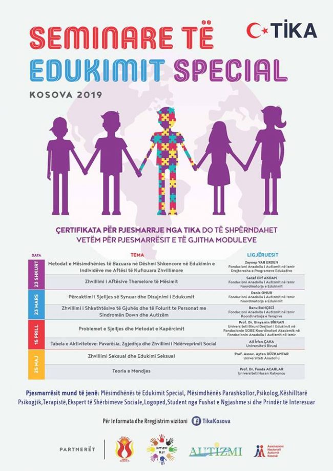 Agjencia Turke për Bashkëpunim dhe Koordinim (TIKA), Zyra Koordinuese në Prishtinë së bashku me akademikët dhe ekspertët e fushës së autizmit nga Turqia është duke organizuar Seminare të Edukimit Special në Kosovë. Ky seminar përbëhet prej 4 moduleve me nga dy ligjerues për çdo modul dhe do të realizohet më 18 prill, në ora 18:00-21:30,…