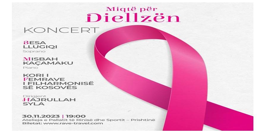 Në Pallatin e Rinisë dhe Sportit në Prishtinë, nesër me datën 30 nëntor, nga ora 19:00, do të mbahet një koncert në mbështetje të mexosopranos Diellza Sylejmani Veseli, dedikuar edhe atyre që kanë luftuar dhe luftojnë me kancerin e gjirit. Në këtë koncert do të marrin pjesë edhe sopranoja Besa Llugiqi, pianisti Misbah Kaçamaku dhe Kori i Grave të Filarmonisë së Kosovës nën drejtimin e Hajrullah Sylës.
