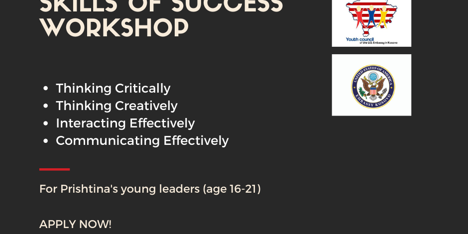 Këshilli Rinor i Ambasadës së SHBA po organizon një punëtori “Shkathtësitë e Suksesit” për të rinjtë e moshës 16-21 vjeç në Prishtinë, me datat 18 dhe 19 janar 2020. Pjesëmarrësit e kësaj punëtorie do të aftësohen në: